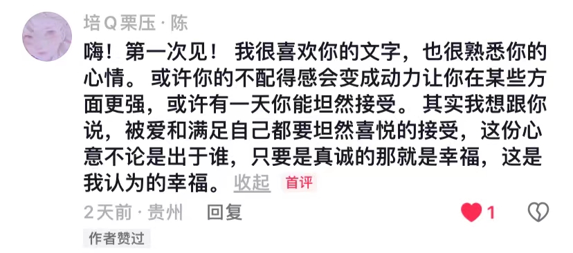 是的,我想我并不拥有相对好事物的配得感,不论其是否存在爱。我将这篇矫情文搬上了我的抖音,收到的评论却让我暖心红框,真的很感谢。